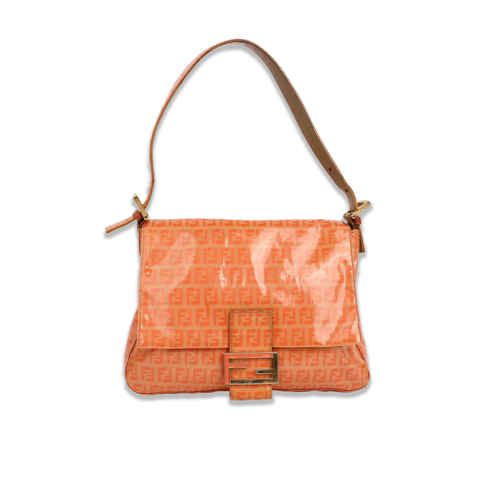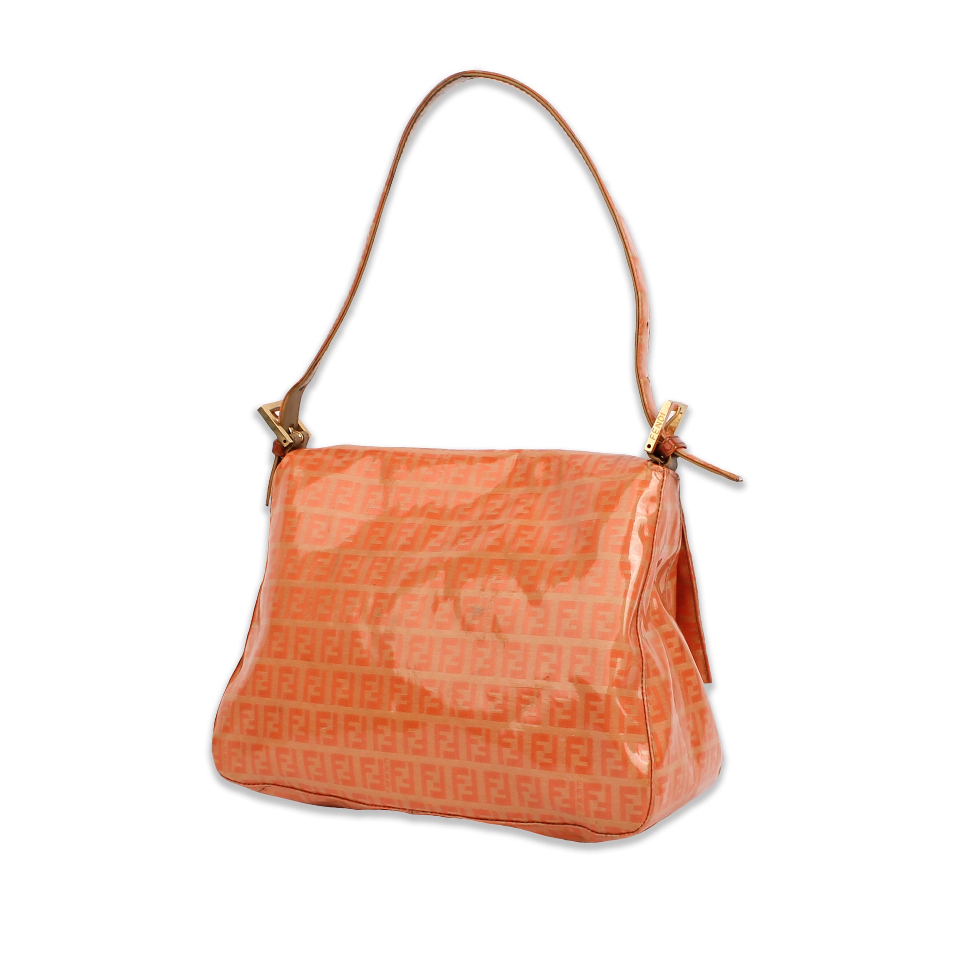 Orange vintage Fendi väska i glansigt och vattentåligt material. Väskan har ett axelband som är anpassningsbart och med guldiga detaljer. Den är använd med kärlek.