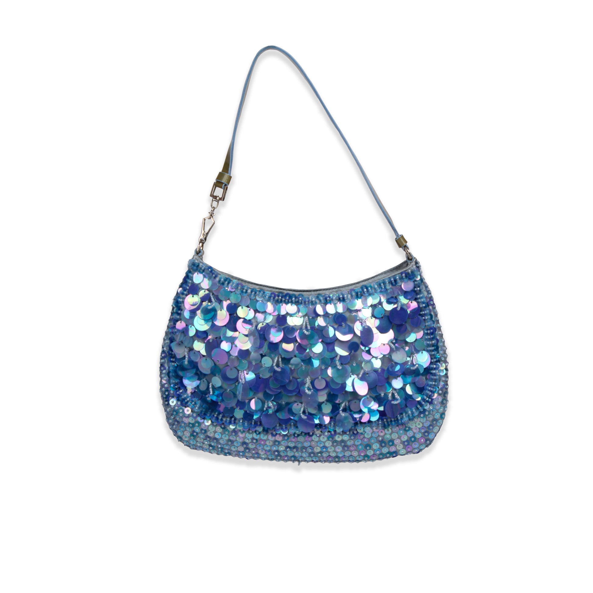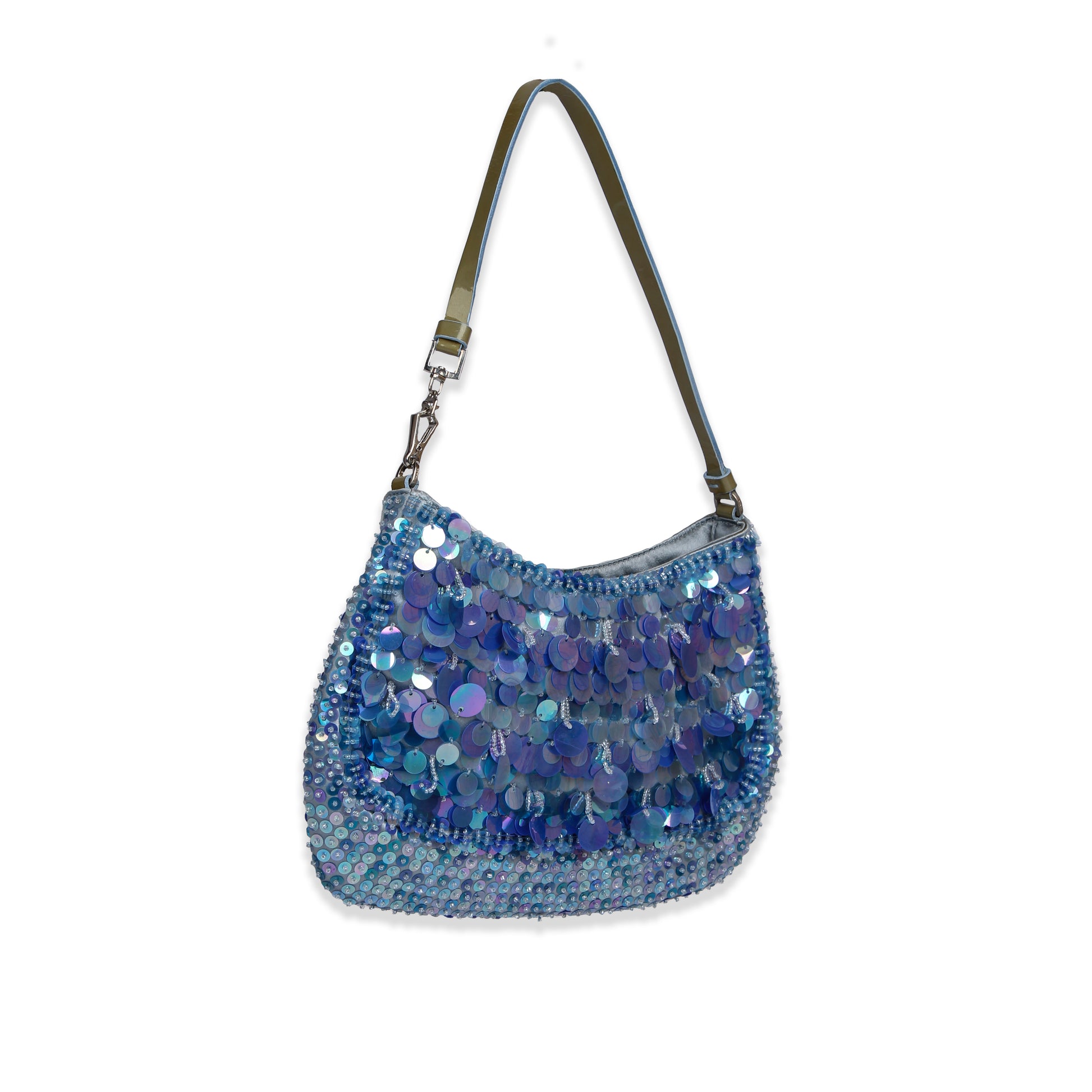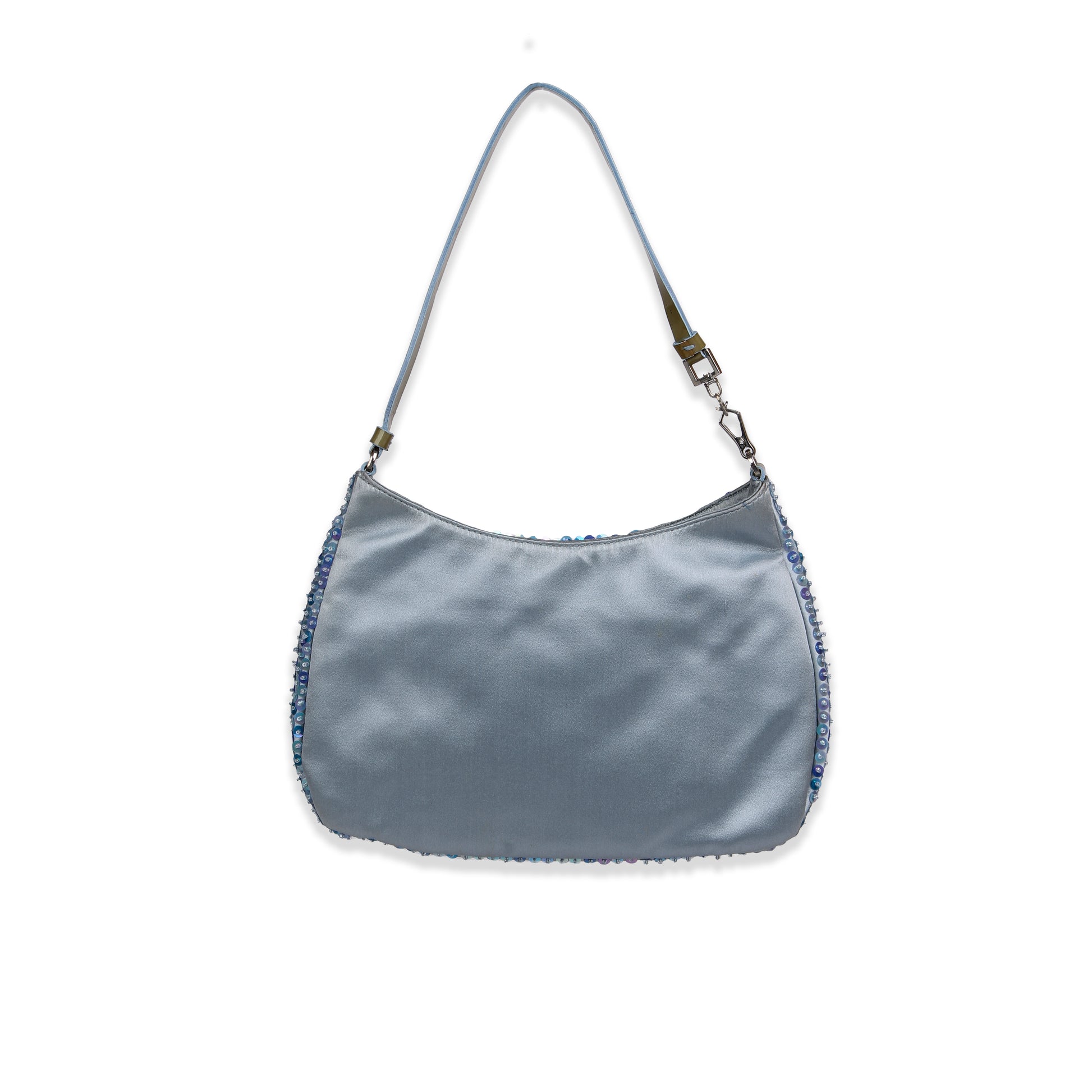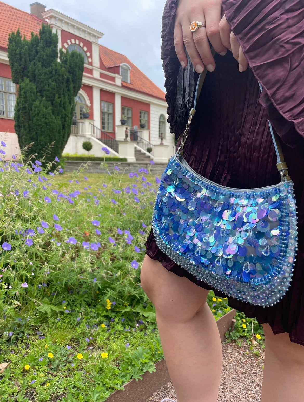 En vintage Prada väska i en fantastiskt glittrig blå färg. Väskan har ett kort axelband i en guld/blå färg.